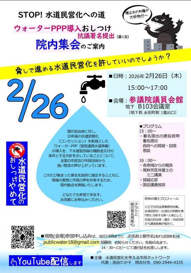【院内集会2/26】水道民営化への道ウォーターPPP導入の方針に対する抗議署名提出(第1次)